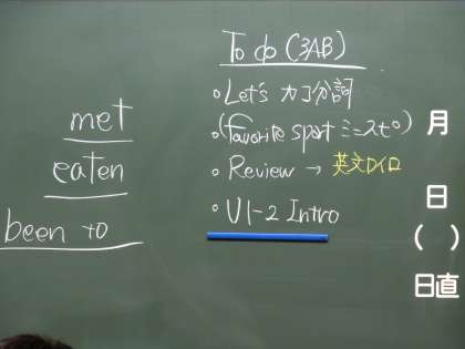 授業中の画像を撮影していて気づくこと。それは多くの先生が今日の授業の流れをあらかじめ板書してあることです。特に中学生になって一番苦手科目になることが多い英語の授業では‘To do リスト’つまり「今ここをやっているよ」とわかるだけでも、学びに向かう気持ちが格段に変わります(菅野)