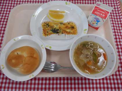 ☆献立 パインパン 牛乳 キッシュ 白いんげんの田舎風スープ 美生柑