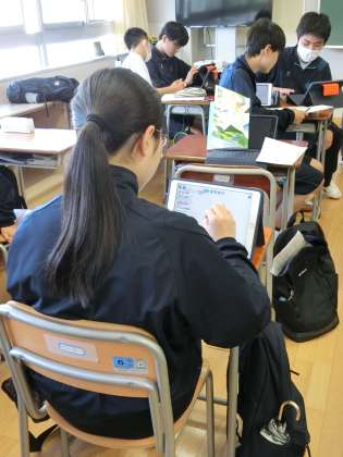 3年生の国語は、教科書で扱っている井上ひさしの『握手』を題材にしています。この時間は主にあらすじや主題を考えていますが、数時間後の授業までには各自で批評を完成させるという課題が与えられています。桜木中に入学した時からこのスタイルを目指して授業を行ってきました、と国語の先生が言われたように3年生の教室ではペアで真剣に意見交換しながら、あるいは一人黙々と下書きに取り組んでいる姿が見られます(菅野)