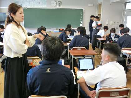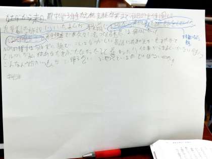 先生と意見交換することも、文章を深く読み込み、自分の考えを深める重要な要素です。特にこの二人は熱心に何度も先生に質問をし考えをまとめようと努力をしていました。書いては消し書いては修正する。その努力のあとを撮影させてもらいました。「字がきれいじゃないんで…」とは本人の弁。いやいや、ここはきれいに書くことが目的ではないから大丈夫です。それよりも、この試行錯誤のあとが何よりも大切で、真の‘美しさ’ですから(菅野)