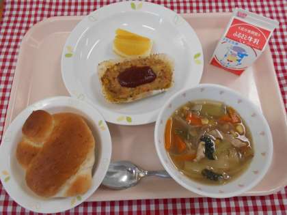 ☆献立 セサミパン 牛乳 ミートローフ 五目スープ 河内晩柑
