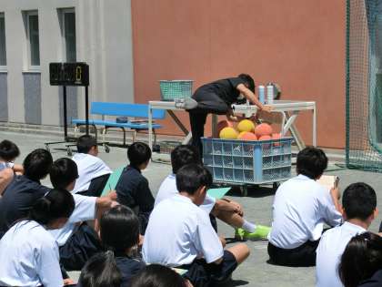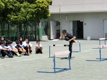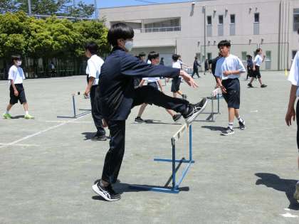 ほとんどの1年生にとっては初めて?と思われるハードルに挑戦しています。先生が細かく丁寧にポイントを押さえて説明をした後、段階を追って練習をしていきます(菅野)