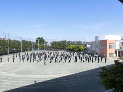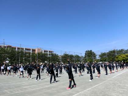 今年度最初の土曜授業日は体力テストから始まりました。校庭に全員が集まり準備運動からスタートです(菅野)