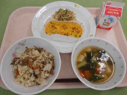 ☆献立 豚肉とごぼうのごはん 牛乳 卵焼き ごま酢かけ すまし汁