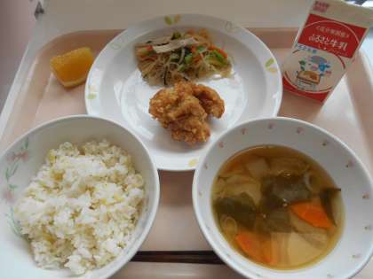 ☆献立 雑穀ごはん 牛乳 鶏肉のからあげ 小松菜サラダ 大根とわかめのみそ汁