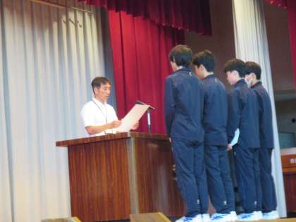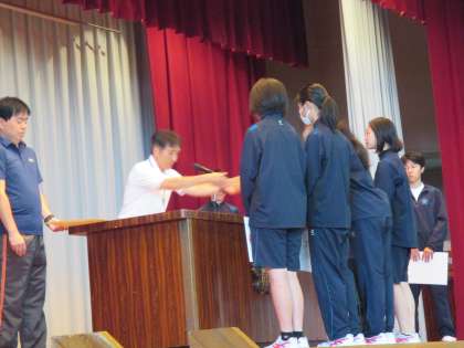 朝礼で表彰して全校生徒が拍手で努力を讃えました。
