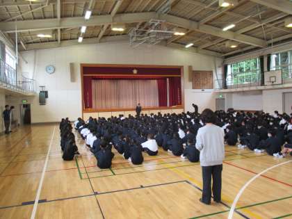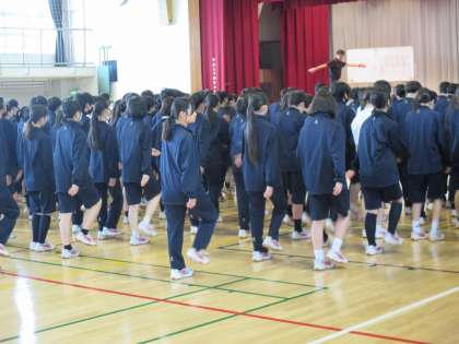 本日は雨天のため、全校生徒が体育館でラジオ体操、行進を練習しました。