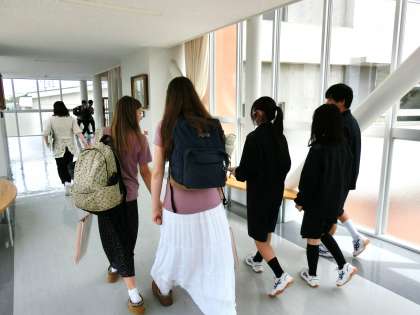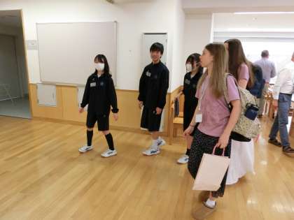3年生の生徒が教室まで案内をします。「英語でなんて言えば…」と考えていた桜木中生でしたが、みな日本語がうまくてびっくり(菅野)