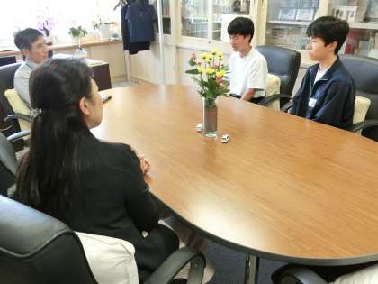 校長面談 陸上競技部 公開日 2024/05/23 更新日 2024/05/23 今日のできごと 『陸上力は人間力、という言葉を大切にしたいです』と語るのは陸上競技部の部長です。練習はきつくてつらいけれど、顧問の先生方が、熱意をもって指導に当たってくださっているのが本当にうれしい、と副部長は頑張れる理由を伝えてくれました。部活面談は今日で最後ですが、人間性を高めることを目的にしている、との2人の言葉にとても感動している校長先生、副校長先生の表情が印象的でした(菅野) いいね(0)