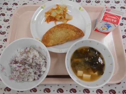 ☆献立 ゆかりごはん 牛乳 ジャンボぎょうざ 辣白菜 豆腐とわかめのみそ汁