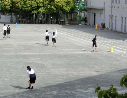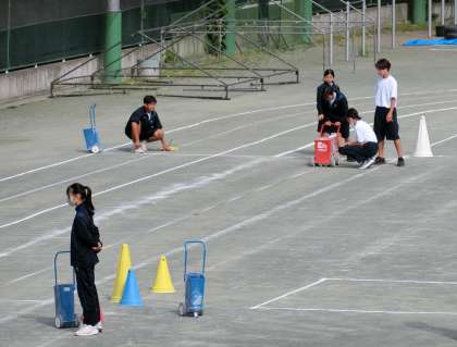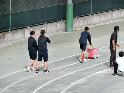 明日の体育大会へ向けて、いよいよ準備も大詰めです。今朝の8時前の校庭では色別対抗リレー練習と並行して、係生徒がライン引きをしてくれています。朝早くからありがとう(菅野)