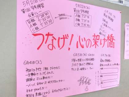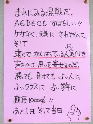 1年生の廊下には、体育大会にむけて今日まで取り組んできた過程が示されています。「まれにみる混戦」どのクラスも全力を出して取り組んできたからこその、明日本番なのですね(菅野)