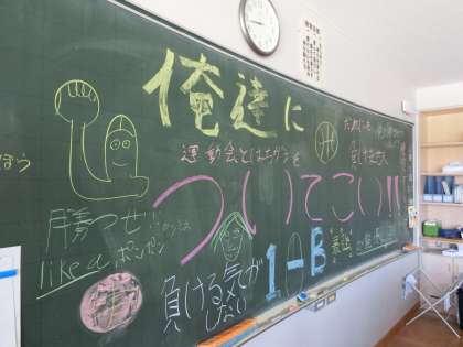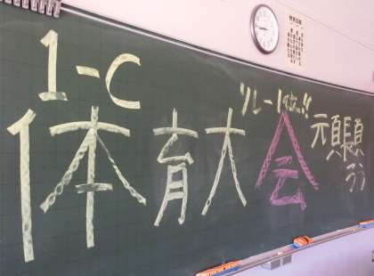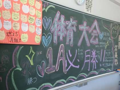 体育大会の真っ最中に教室で撮影した各クラスの黒板です。まずは1年生から(菅野)