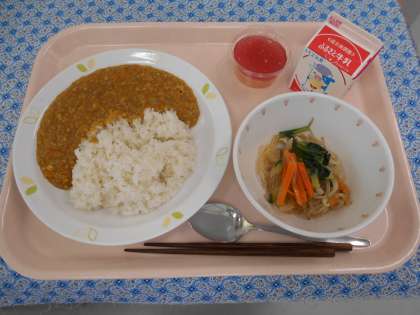 ☆献立 キーマーカレーライス 牛乳 糸寒天と野菜のあえもの あじさいゼリー