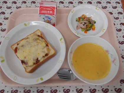 ☆献立 ピザトースト 牛乳 キャロットポタージュ ビーンズサラダ