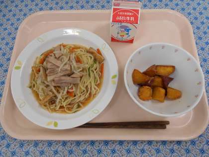 ☆献立 冷やし中華 牛乳 キャラメルポテト