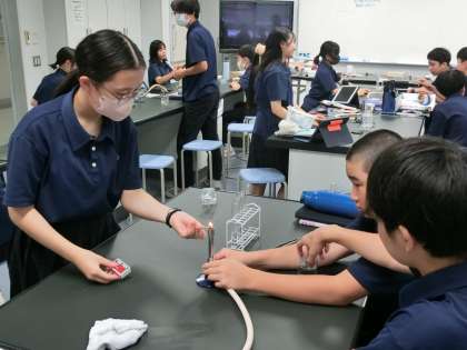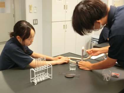 金属を燃やすためガスバーナーに火をつけて炎を調節しています。青白い炎が理想ですが、中には勢いよく‘Fire’と輝く班も。先生が助っ人に入ります(菅野)