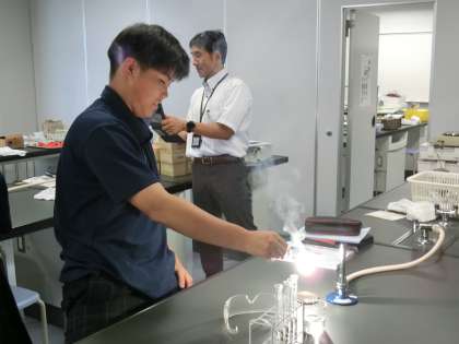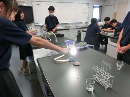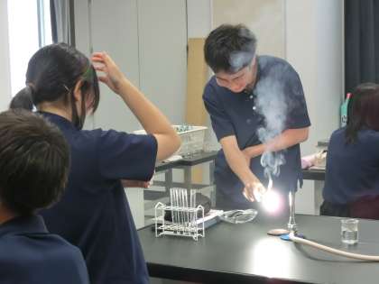 マグネシウムを燃やしています。「強い光を放つので、長いことじっと炎を見ないようにしましょう」と注意がありました。でも…ついつい見入ってしまいます。。(菅野)