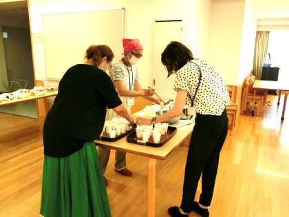 今日と明日の2日間で1年生は和食体験授業を実施します。鰹節づくりの老舗であるにんべんから「だしアンバサダー」をお招きしての授業です。まずはかつおだしの試飲から。鰹節から今とれたての出汁を学校支援コーディネーターさんがカップに注いでくださいました(菅野)