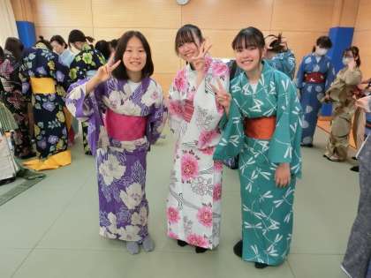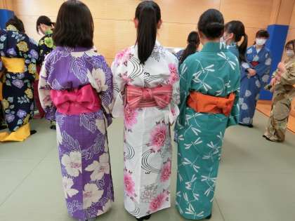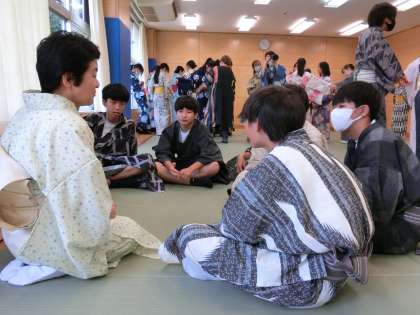 早くも帯締めまで完成した生徒にモデルになってもらいました。もちろんあでやかな後ろ姿もパチャ!先ほど何度も先生に聞きなおしていた生徒たちも、やっと自分たちで着付けができるようになり、先生を囲んで談笑しています(菅野)