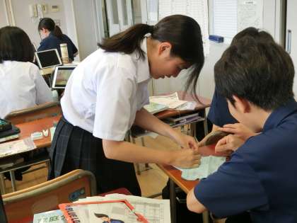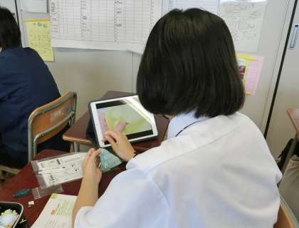 友達から教えてもらっている生徒の姿があれば、教科書のQRコードから裁縫動画をダウンロードし、時々止めて確認しながら縫っている生徒も。今どきは教えてもらう先生の形も様々です(菅野)