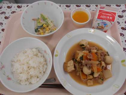 ☆献立 ご飯 牛乳 豚肉のみそ煮 アスパラガスサラダ みかんぜりー