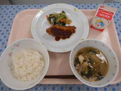 ☆献立 ご飯 牛乳 魚のフライ カルシウムたっぷりサラダ とうがん玉ねぎのスープ