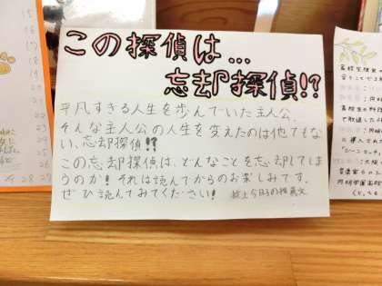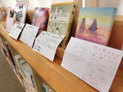 図書委員の生徒がお薦めする本のコーナーがこちら。PОPをみると思わず手に取りたくなります(菅野)