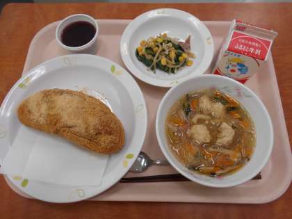 9月13日(金)今日の給食 ★2年生リクエスト給食 公開日 2024/09/13 更新日 2024/09/13 給食 ☆献立 あげパン 牛乳 春雨と肉団子のスープ ほうれん草サラダ ぶどうゼリー いいね(0) 給食