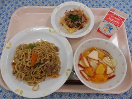 ☆献立 塩焼きそば 牛乳 ミニお好み焼 フルーツポンチ