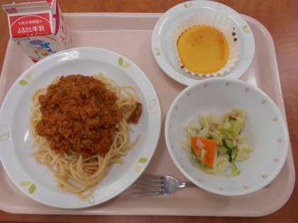 ☆献立 スパゲティミートソース 牛乳 ピクルス キャロットケーキ