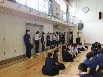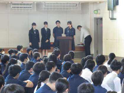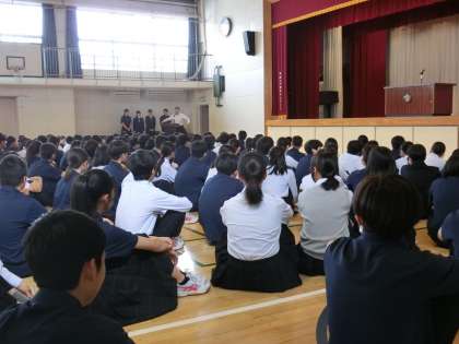 今朝は生徒会朝会の日。8時25分のチャイムが体育館で鳴った時にはほぼ全員がすわっていました。司会の生徒が最初に言った言葉が「これから生徒会朝会を始めます」実はこれ、すごいことなんです!なぜならば、座っている時にあった私語(それもかなり控えめな音量でした)が、チャイムの『キンコ〜ン、カンコーン〜』と同時にピタッと自然におさまるからなのです。「静かにしてください」の言葉は、桜木中の朝会では必要ありませんね(菅野)