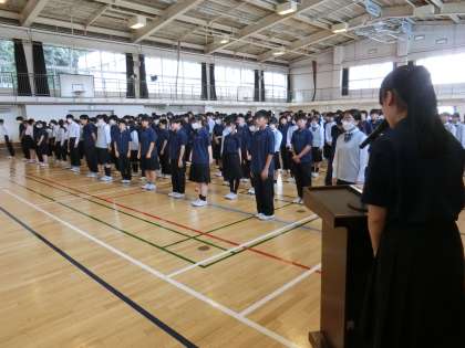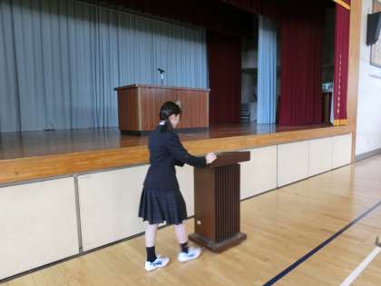 朝会終了後、生徒たちが教室に戻っていく時、先ほど挨拶をした役員や委員長が演台や司会台を片付けていました。自分たちの役割を自覚し、きちんと学校や皆のために貢献する姿勢があるからこそ、感謝の言葉が出てきたことを実感する瞬間でした(菅野)