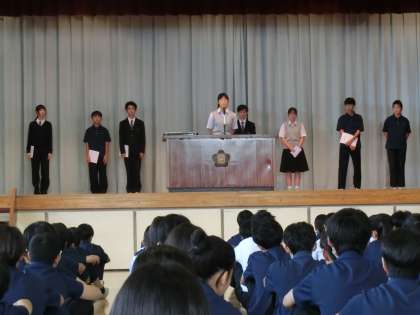 任命式を待つ委員長さん、舞台袖では緊張感がピークに達していましたが、演台の前に立つと、そんな緊張感はどこへ?と思うほど皆堂々と任命書を受け取り、挨拶もしっかり生徒の顔をみてできていました(菅野)