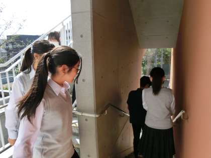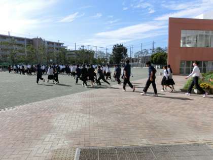 主事室から出火、という想定なのでいつもの中央階段は使えません。今日は外の非常階段も使っての訓練。校舎内の階段を使う生徒はハンカチやマスクで煙対策をしています(菅野)