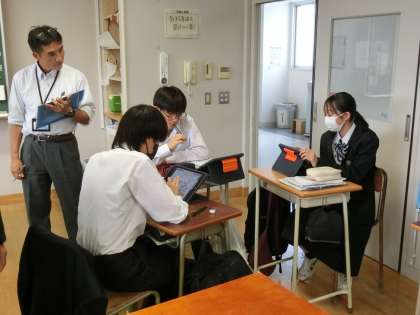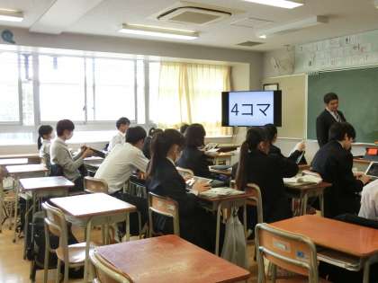 3年生の英語の授業です。「4コマ」って?はい!外国から来た方に4コマ漫画の内容を説明してみよう、という課題です。グループを作って意見交換をしています(菅野)