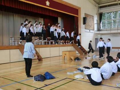 これも大事 公開日 2024/10/22 更新日 2024/10/22 今日のできごと 音楽の先生が全体へのアドバイスの後「最初のクラスは入退場が少し混乱していたからやっておこう」と呼びかけ、舞台への入退場を確認しました。たかが入退場、と思うなかれ。特に初めて臨む1年生。緊張でカチカチになってしまうところに、本番で入場にミスがあるとよけい緊張し、頭が真っ白になり歌に直結します。せっかく今まで練習してきたのに、ということにならないための配慮です(菅野) いいね(0)