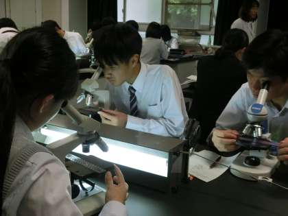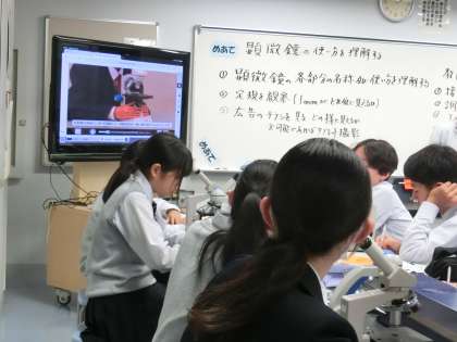 2年生の理科の授業では顕微鏡の使い方について学んでいます。初めて顕微鏡に触れる生徒も多く、レンズを覗いただけでは見えないものもあり興味深々です(菅野)