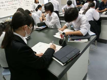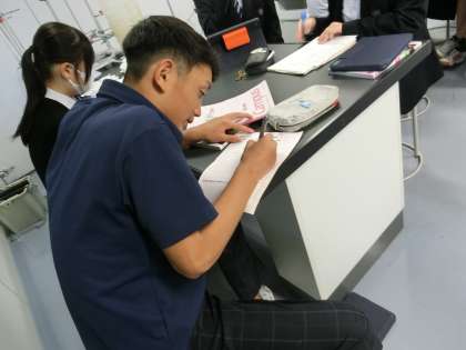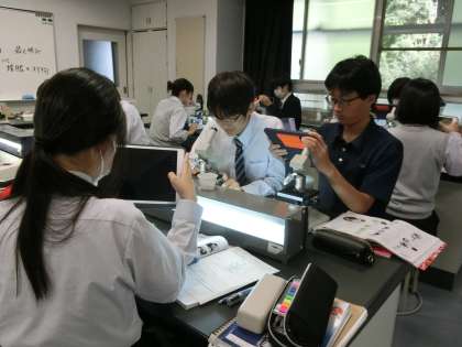 顕微鏡で見えたものをタブレットのカメラで撮影し記録に残したあと、残り5分間で振り返り用紙に、今日の学習内容を記入します(菅野)