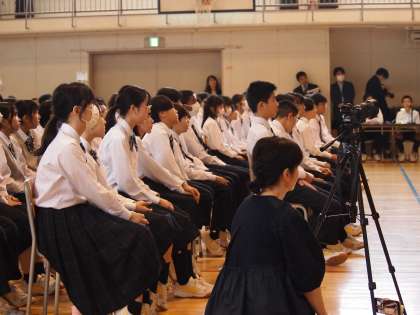 上級生の歌を聴く1年生の横顔です。圧倒され、引き込まれ、感動していることがよくわかります。それは自分たちも合唱を作り上げることがどれだけ大変か、わかったからこそ上級生の完成度に驚くのです。さあ、来年は皆さんが1年生に、このような表情で見て、聞いてもらう番です。今回の合唱コンクールで得た成果、課題をぜひ自分たちのものにしてくださいね(菅野)