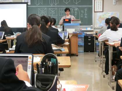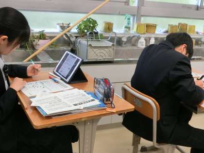 日本画について学んでいます。2週間後にある期末考査の範囲を解説しているので、いつにもまして(?)真剣な表情です(菅野)