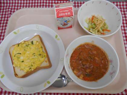 ☆献立 たまごトースト 牛乳 鶏肉のトマトソース煮 じゃがいものハニーサラダ