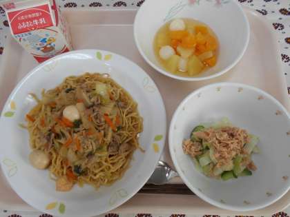 ☆献立 五目あんかけそば ツナサラダ フルーツ白玉