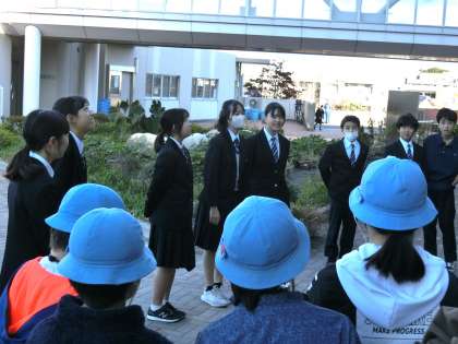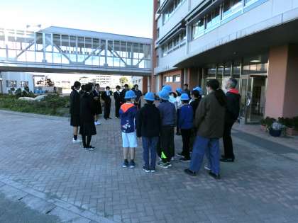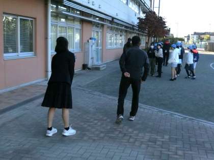 8時15分になると2つの門に分かれていた児童、生徒たちが集まり代表生徒から挨拶があります。「今日ここで皆さんにあいさつをし、取り組んだことを今後の学校での生活に活かしていきましょう」小学生からも元気な返事がありました。帰り際、担当の先生が「今のお姉さんのあいさつは点数をつけるとすれば何点でしたか〜」と小学生に質問をしてみました。返ってきた答えは…。ここでは内緒にしておきますが、小学生からすれば、中学生にあこがれの気持ちをもたせる立派なあいさつでしたよ(菅野)
