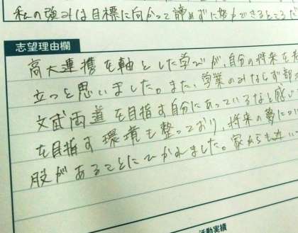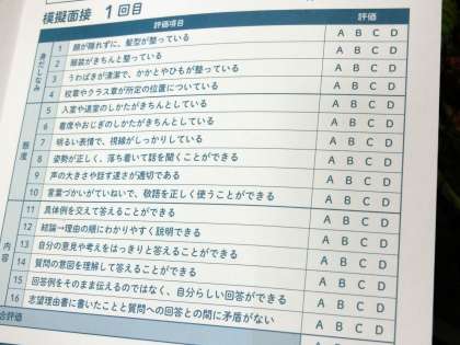 面接試験に向けて 公開日 2024/11/12 更新日 2024/11/12 今日のできごと 早くも志望理由を完成させた生徒に「写してもいい?」と聞いてパチっ。「字がきれいじゃないので…」いやいや、十分きれいで丁寧です。 模擬面接での評価項目もテキストに掲載されていました。これを機に、大人と話をするときに、このような項目を意識すると、ぐっと‘おとな’に近づけるかもしれませんね(菅野) いいね(0)