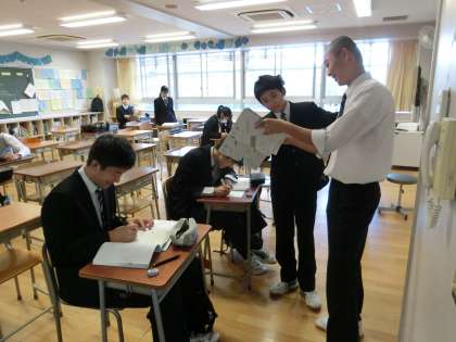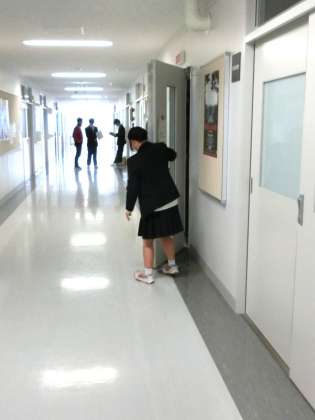 8時過ぎの廊下からは生徒の様々な様子が見えます。3年生の教室では、1時間目の数学を友達同士で最終確認していました。一方、放送室の扉を開けている生徒がいます。試験中でも放送委員の活動はお休みではありません。お疲れさま!(菅野)