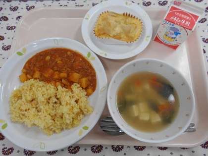 ☆献立 チリビーンズライス 牛乳 わかめスープ りんごのファーブルトン