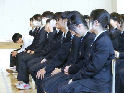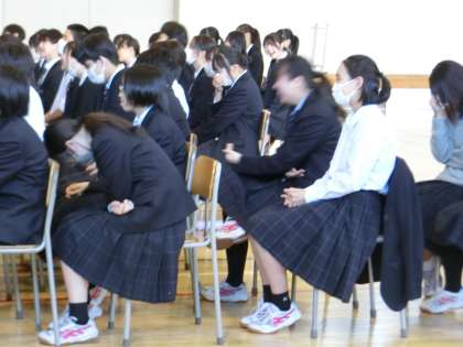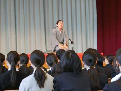 参加している2年生も、解説を聞く時は真剣に顔を向けて聞き、面白い落語の場面では思いっきり笑う、というお客さんのお手本のようです。拍手のタイミングも完璧で、三遊亭ごはんつぶさんからも「素晴らしい生徒さんです」と、お褒めの言葉をいただきました(菅野)