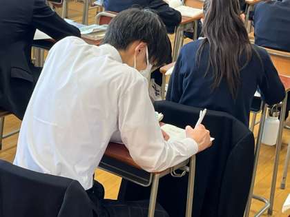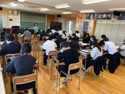 流れる音源を聴きながら、全員が楽譜、歌詞を見て自分の考えをまとめています。