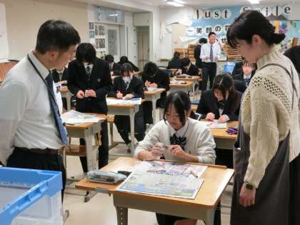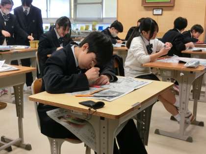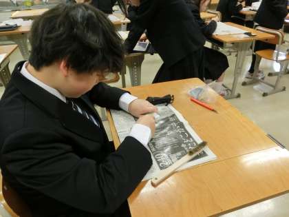 篆刻に取り組んでいます。授業開始の瞬間から夢中で削っています(菅野)